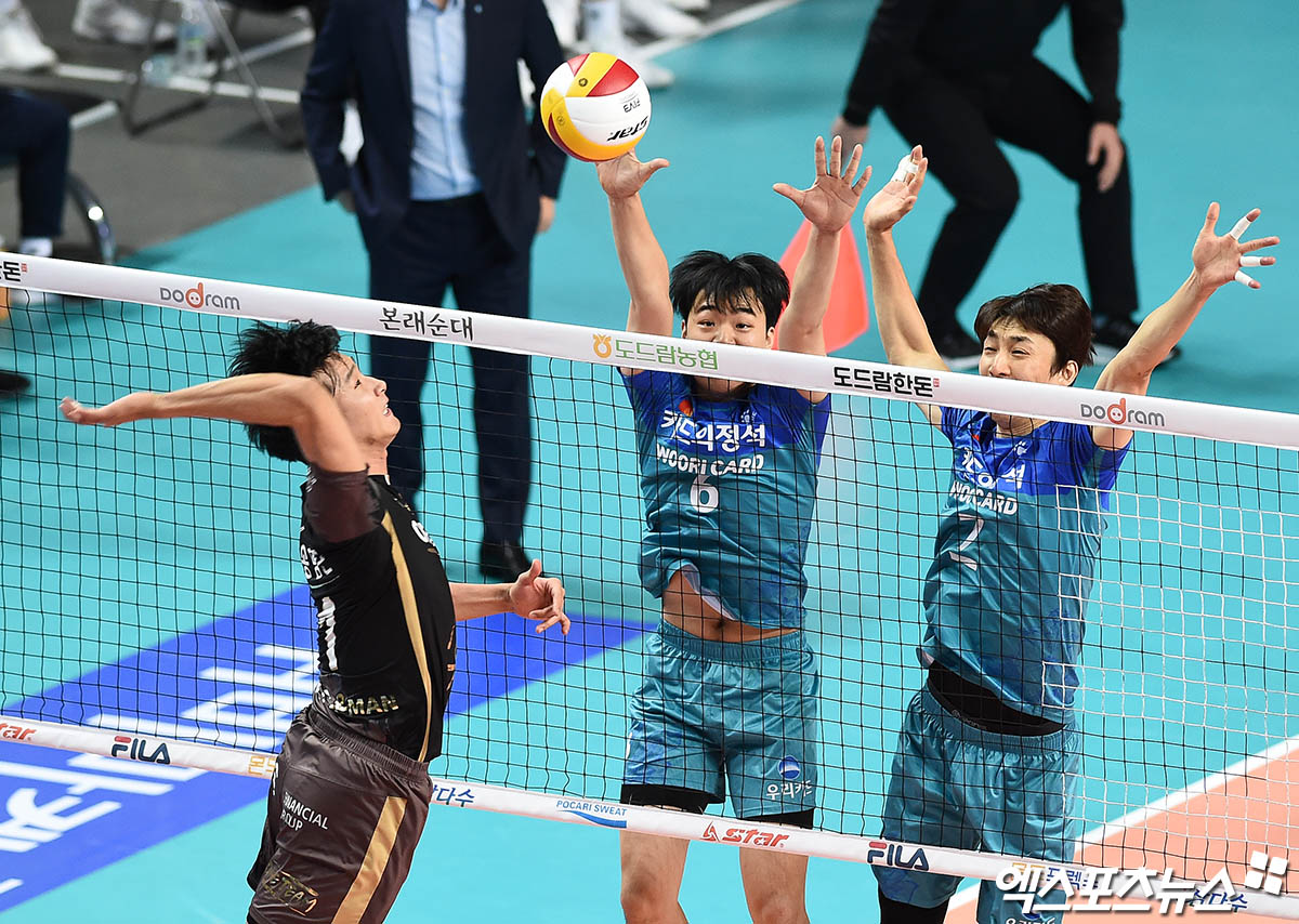 [엑스포츠뉴스 장충, 박지영 기자] 7일 오후 서울 장충체육관에서 열린 '도드람 2020-2021 V리그' 남자부 우리카드와 OK금융그룹의 경기, OK금융그룹 송명근이 공격을 시도하고 있다.