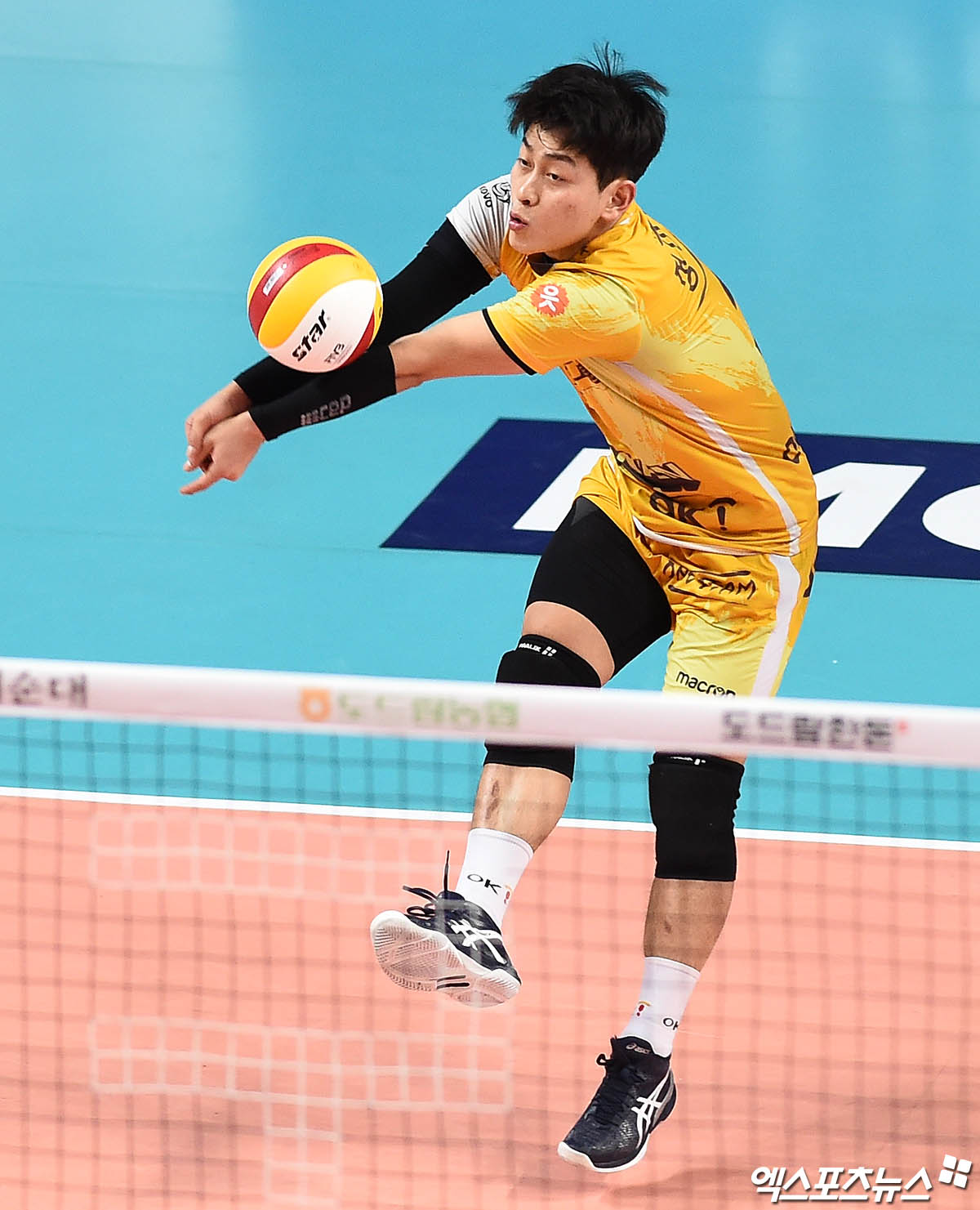 OK금융그룹 정성현이 서브 리시브를 하고 있다.