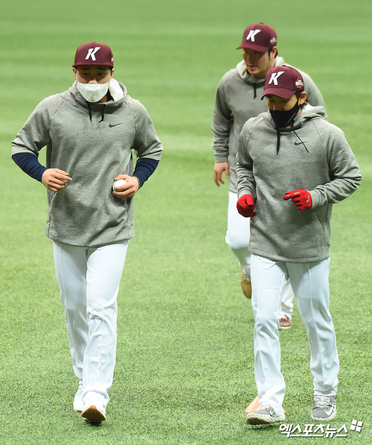 [엑스포츠뉴스 고척, 윤다희 기자] 2일 오후 서울 구로구 고척스카이돔에서 진행된 키움 히어로즈 스프링캠프에 참석한 김하성, 이용규가 훈련에 임하고 있다.