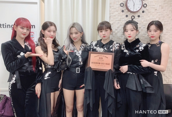 지난 8일 오후 (여자)아이들은 한터차트의 공식 초동 인증패를 수상했음을 전하며, 이를 인증하는 사진 한 장을 공개했다.