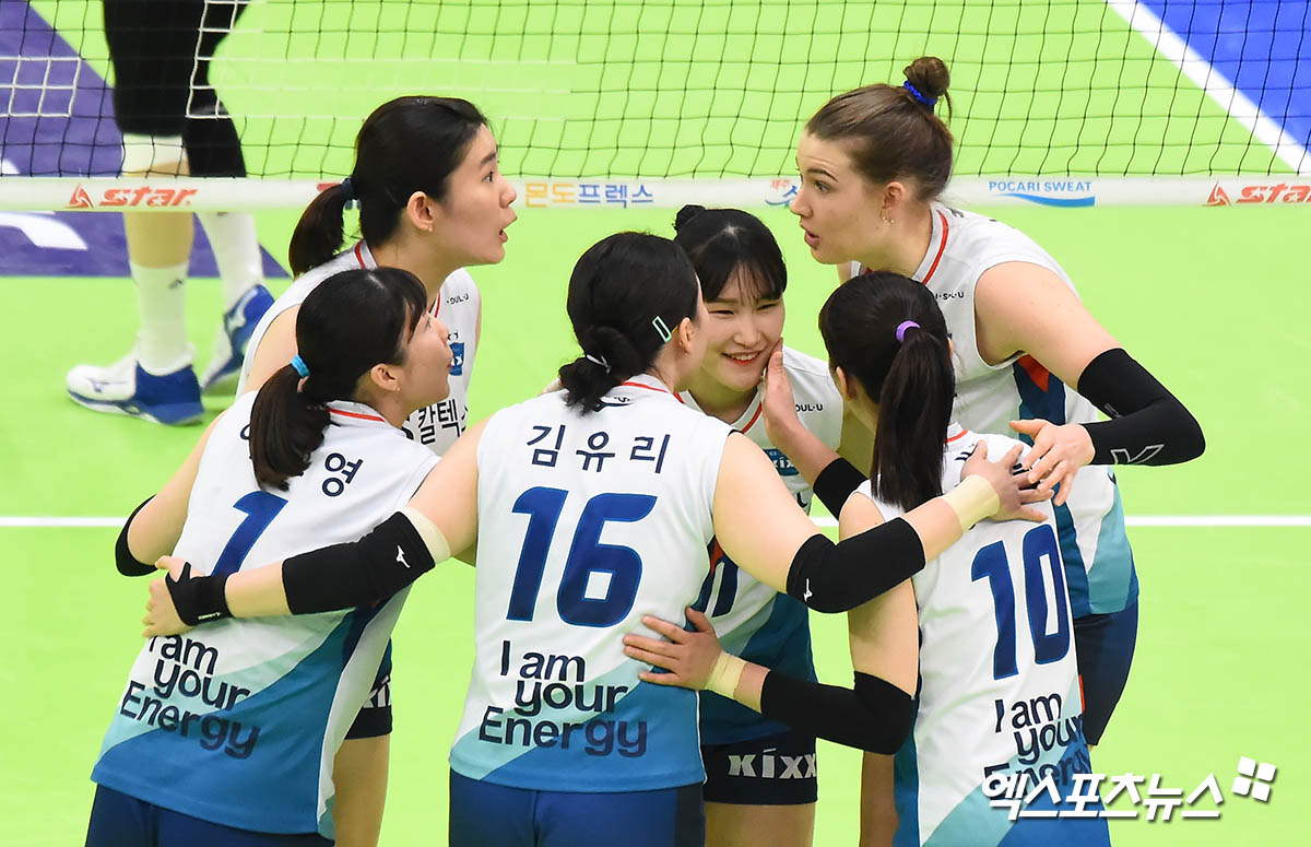 [엑스포츠뉴스 수원, 윤다희 기자] 9일 오후 수원실내체육관에서 열린 ‘2020-2021 도드람 V리그’ 여자부 현대건설과 GS칼텍스의 경기, GS칼텍스 선수들이 득점 후 기쁨을 나누고 있다.