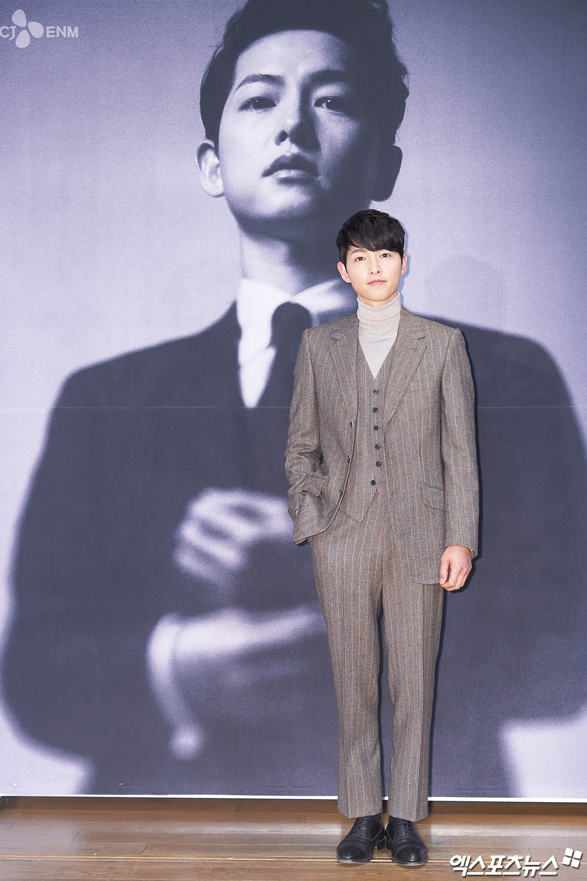 [엑스포츠뉴스 박지영 기자] 15일 오후 온라인 생중계로 진행된 tvN 새 토일드라마 '빈센조' 제작발표회에 참석한 배우 송중기가 포토타임을 갖고 있다.