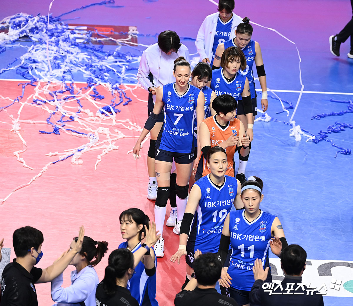 이날 경기에서 승리한 기업은행 선수들이 기뻐하고 있다.