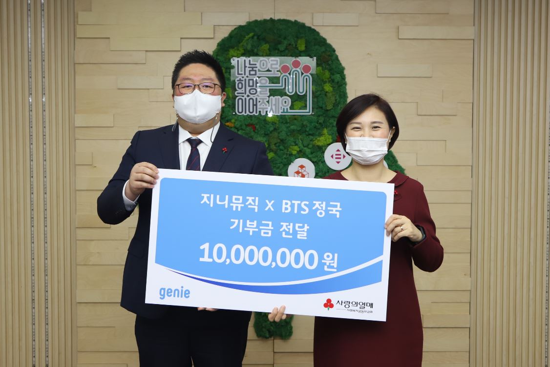 [엑스포츠뉴스 김미지 기자] 지니뮤직(대표 조훈)이 9일 오전 서울 중구 세종대로 사랑의열매 회관에서 방탄소년단 정국의 이름으로 1,000만 원의 기부금을 사랑의열매 사회복지공동모금회(회장 예종석)에 전달했다.