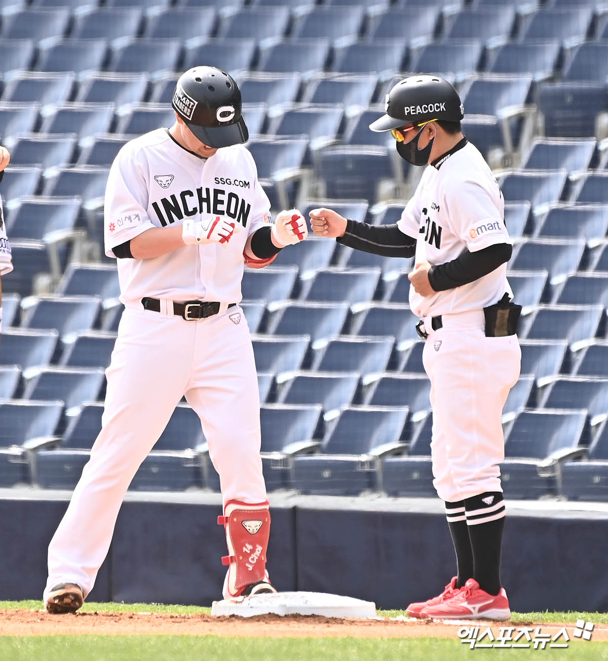 [엑스포츠뉴스 창원, 윤다희 기자] 21일 오후 경상남도 창원NC파크에서 열린 SSG 랜더스와 NC 다이노스의 시범경기, 1회초 1사 1루 SSG 최정이 중전 안타를 날린 후 코칭 스태프와 기쁨을 나누고 있다.