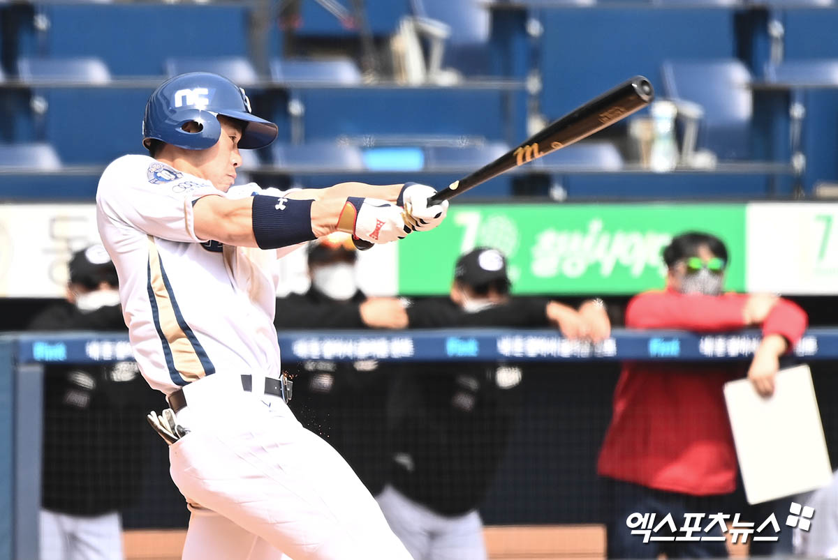 [엑스포츠뉴스 창원, 윤다희 기자] 21일 오후 경상남도 창원NC파크에서 열린 SSG 랜더스와 NC 다이노스의 시범경기, 2회말 2사 NC 이명기가 솔로 홈런을 날리고 있다.