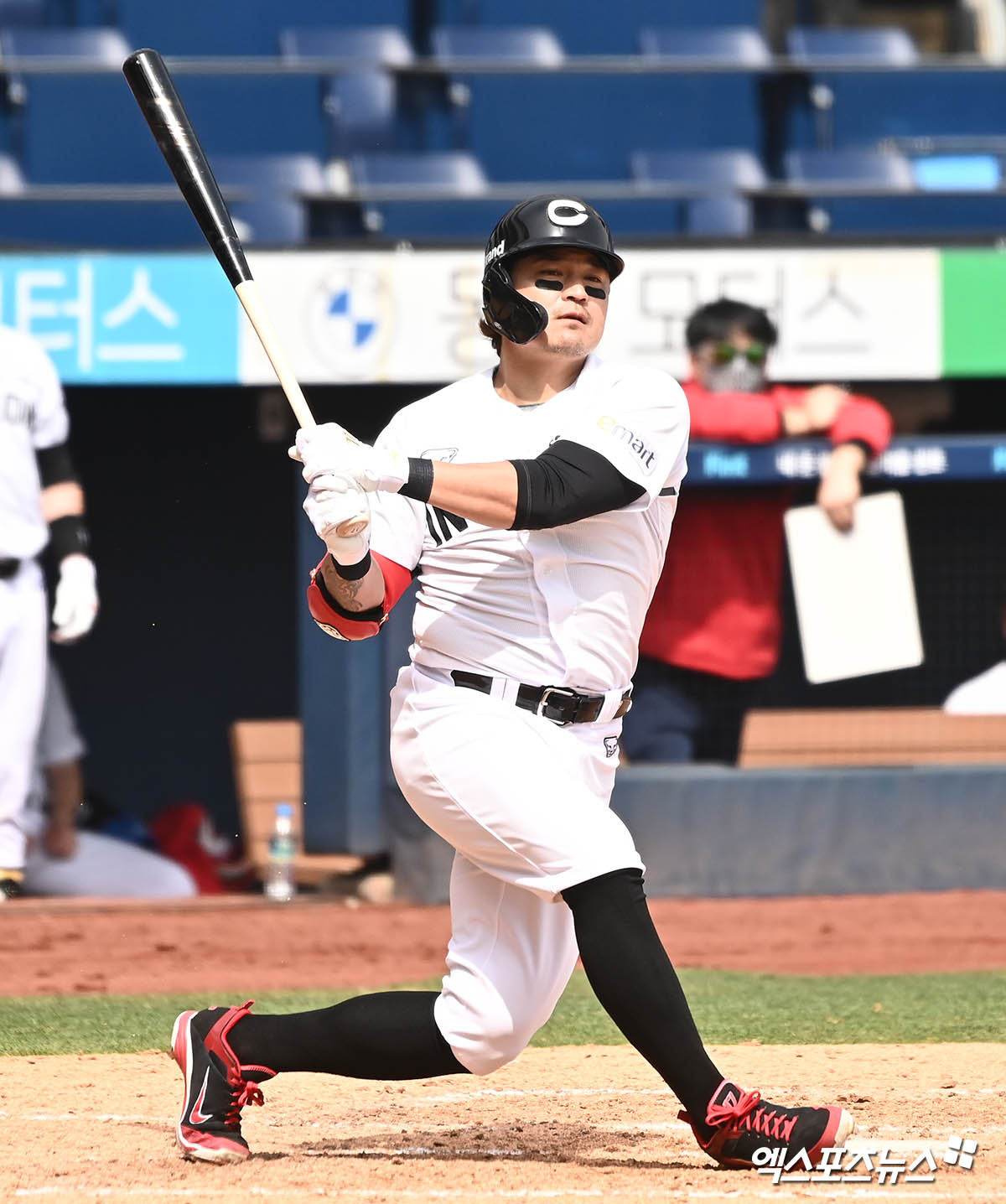 [엑스포츠뉴스 창원, 윤다희 기자] 21일 오후 경상남도 창원NC파크에서 열린 SSG 랜더스와 NC 다이노스의 시범경기, 3회초 무사 1루 SSG 추신수가 헛스윙을 하고 있다.