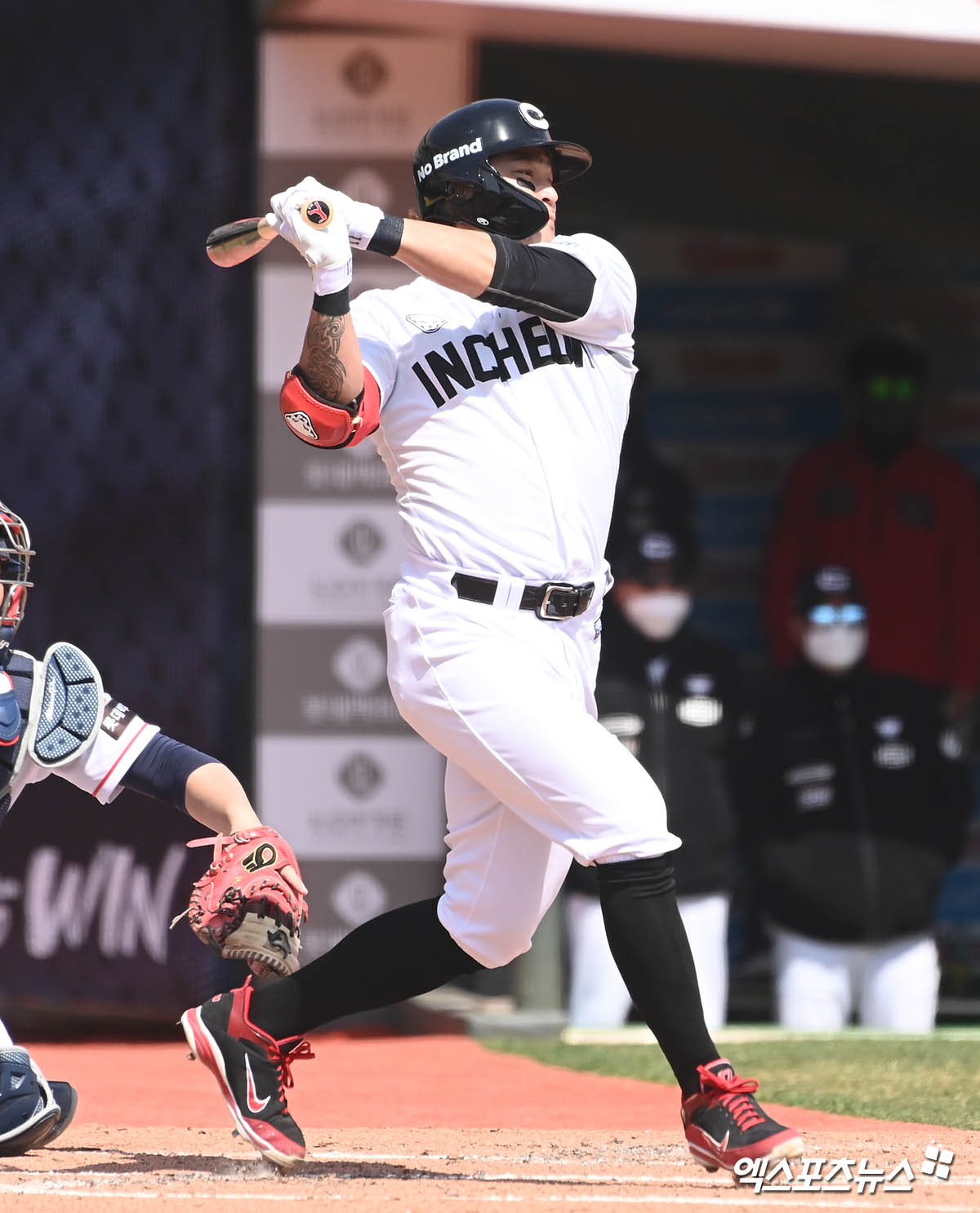 [엑스포츠뉴스 부산, 윤다희 기자] 23일 오후 부산 동래구 사직야구장에서 열린 SSG 랜더스와 롯데 자이언츠의 시범경기, 3회초 2사 만루 SSG 추신수가 2타점 적시타를 날리고 있다.