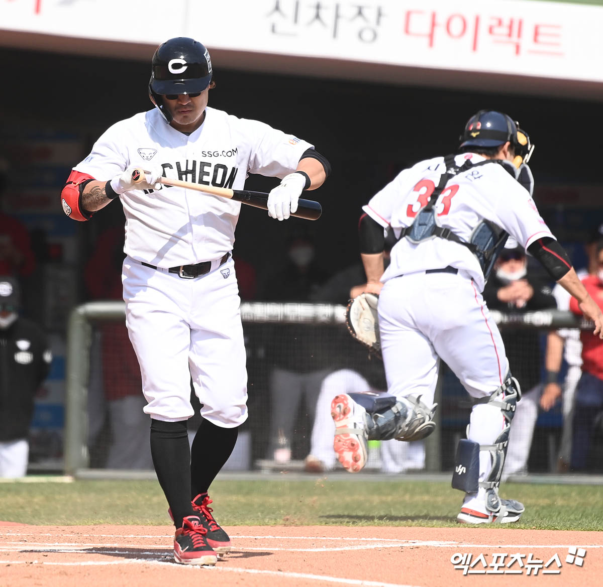 [엑스포츠뉴스 부산, 윤다희 기자] 23일 오후 부산 동래구 사직야구장에서 열린 SSG 랜더스와 롯데 자이언츠의 시범경기, 6회초 2사 SSG 추신수가 볼넷을 얻어 출루하고 있다.