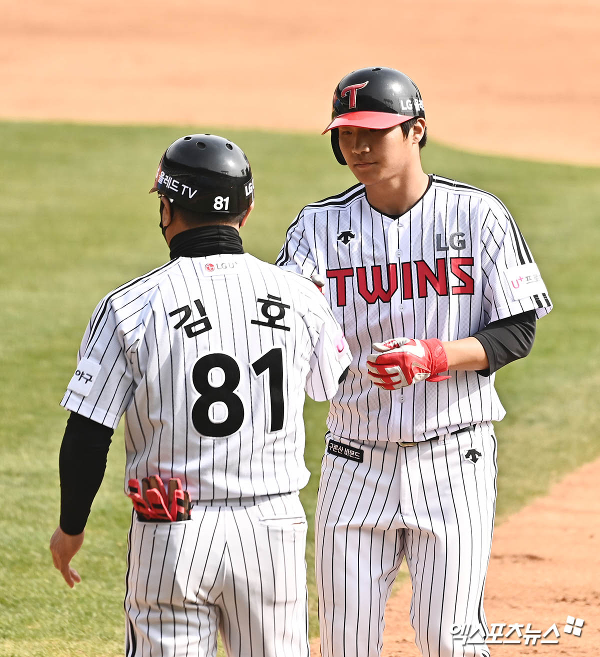[엑스포츠뉴스 잠실, 윤다희 기자] 26일 오후 서울 송파구 잠실야구장에서 열린 두산 베어스와 LG 트윈스의 시범경기, 7회말 1사 LG 문보경이 좌중간 안타를 날리고 김호 코치와 기쁨을 나누고 있다.