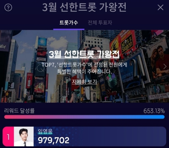 임영웅은 ‘선한트롯’ 3월 가왕전에서 임영웅은 97만 9702표를 1위에 올랐다.