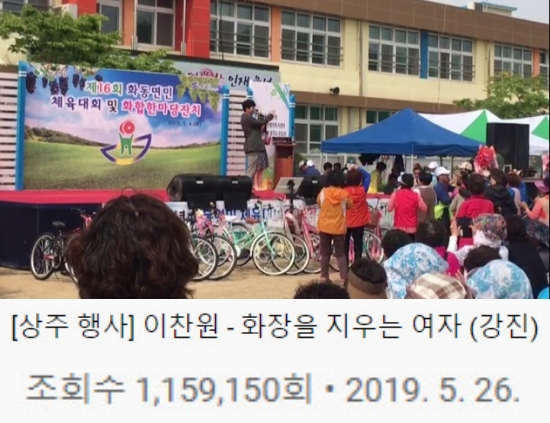 지난 2019년 5월 이찬원 유튜브 채널 ‘이찬원’에는 “[상주 행사] 이찬원 - 화장을 지우는 여자 (강진)”이라는 제목의 영상이 게재됐다.