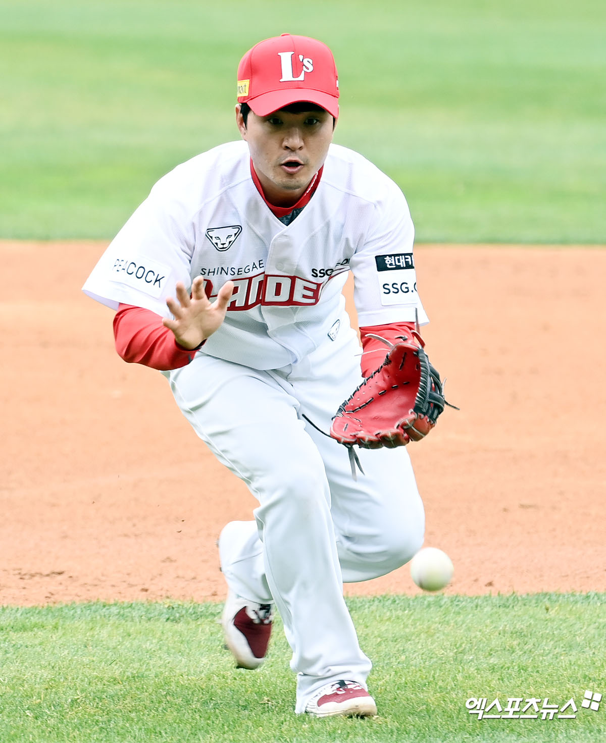 SSG 김성현이 펑고를 받고 있다.