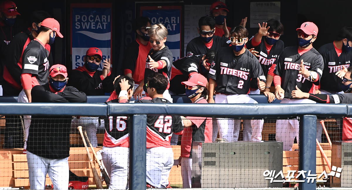 [엑스포츠뉴스 잠실, 윤다희 기자] 4일 오후 서울 송파구 잠실야구장에서 열린 ‘2021 신한은행 SOL KBO리그’ KIA 타이거즈와 두산 베어스의 개막전 경기, 3회초 2사 3루 KIA 최원준이 김선빈의 1타점 적시타 때 득점 후 선수단과 기쁨을 나누고 있다.