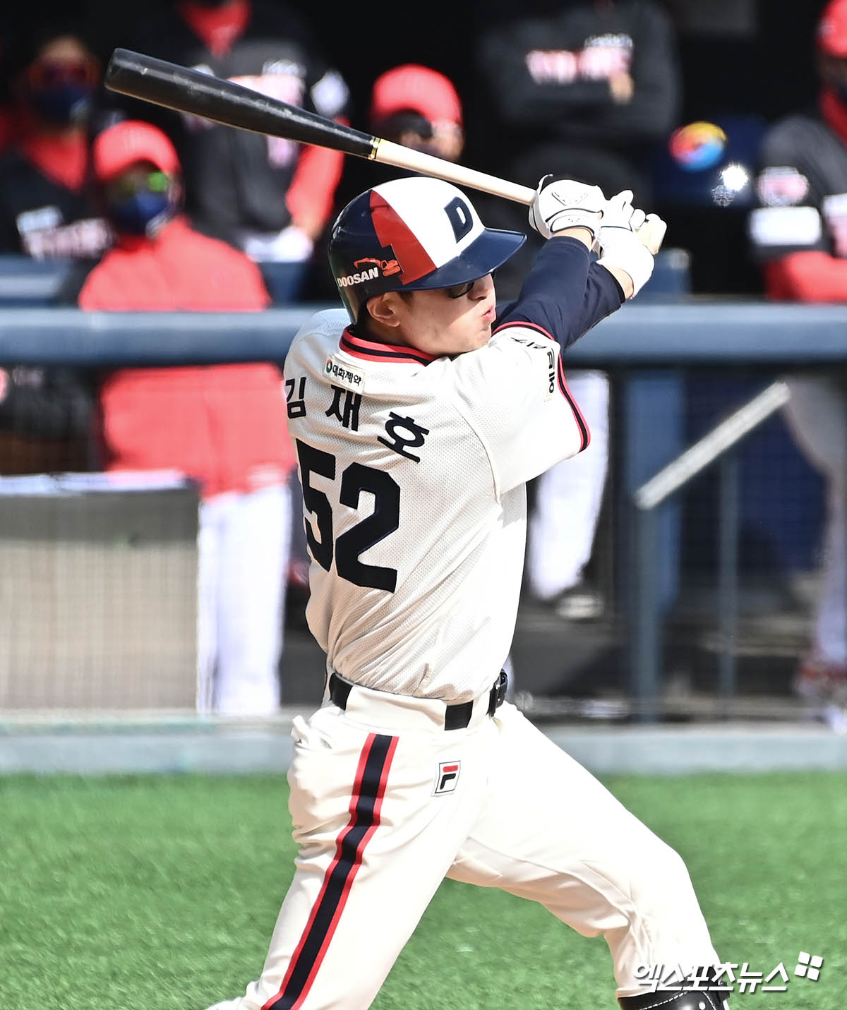 [엑스포츠뉴스 잠실, 윤다희 기자] 4일 오후 서울 송파구 잠실야구장에서 열린 ‘2021 신한은행 SOL KBO리그’ KIA 타이거즈와 두산 베어스의 개막전 경기, 5회말 2사 1루 두산 김재호가 우전안타를 날리고 있다.