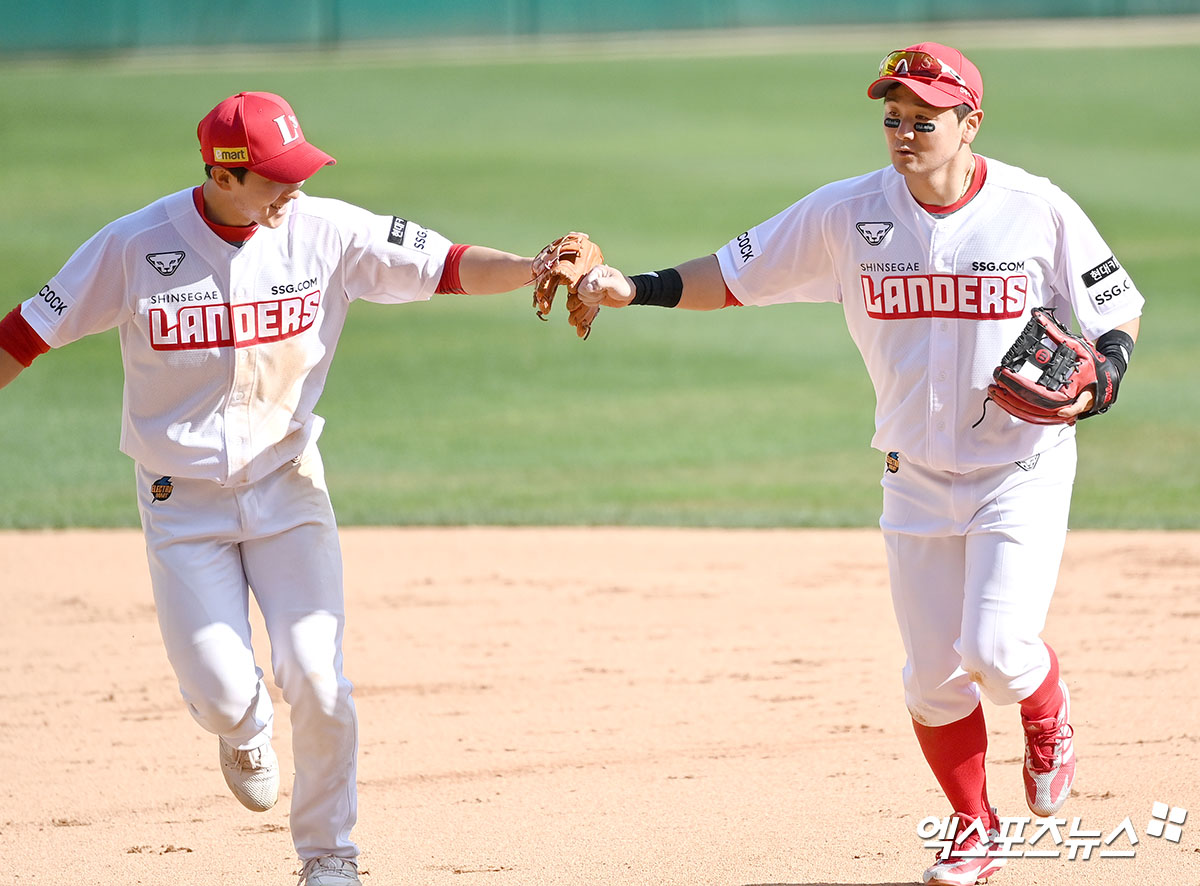 [엑스포츠뉴스 인천, 김한준 기자] 4일 오후 인천 SSG랜더스필드에서 열린 '2021 신한은행 SOL KBO리그' 롯데 자이언츠와 SSG 랜더스의 경기, 7회초 수비를 마친 SSG 박성한과 최주환이 글러브를 맞대며 더그아웃으로 향하고 있다.