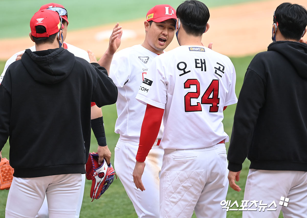 [엑스포츠뉴스 인천, 김한준 기자] 4일 오후 인천 SSG랜더스필드에서 열린 '2021 신한은행 SOL KBO리그' 롯데 자이언츠와 SSG 랜더스의 경기, SSG가 최정-최주환의 멀티 홈런에 힘입어 롯데에 5:3으로 승리하며 역사적 창단 첫 승을 기록했다.