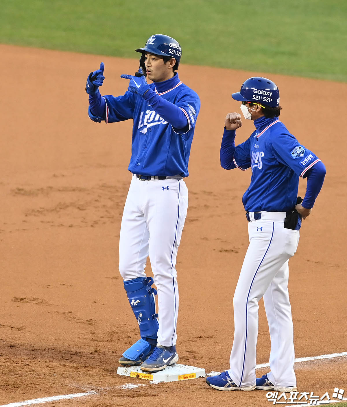 [엑스포츠뉴스 잠실, 박지영 기자] 6일 오후 서울 송파구 잠실야구장에서 열리는 '2021 신한은행 SOL KBO리그' 삼성 라이온즈와 두산 베어스의 경기, 1회초 1사 1루 삼성 구자욱이 안타를 때려낸 뒤 세리머니를 하고 있다.