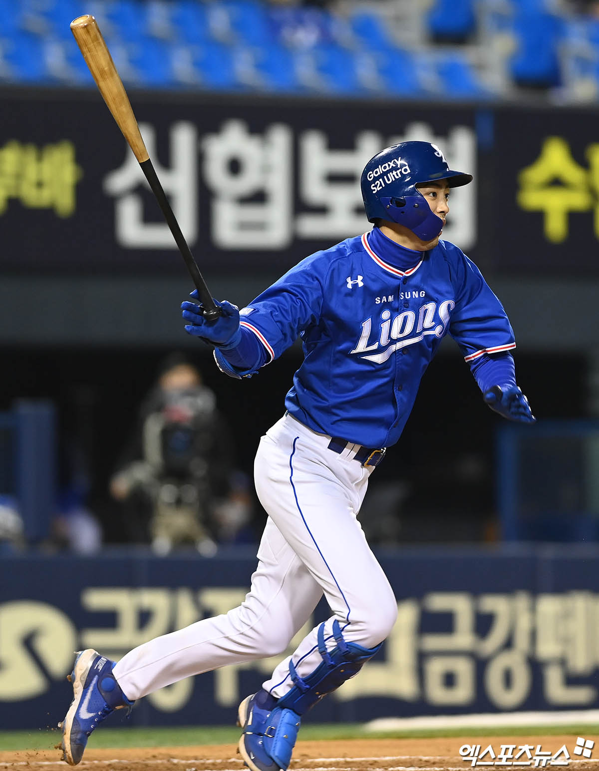 [엑스포츠뉴스 잠실, 박지영 기자] 6일 오후 서울 송파구 잠실야구장에서 열리는 '2021 신한은행 SOL KBO리그' 삼성 라이온즈와 두산 베어스의 경기, 3회초 2사 삼성 구자욱이 타격하고 있다. 결과는 1루수 땅볼.
