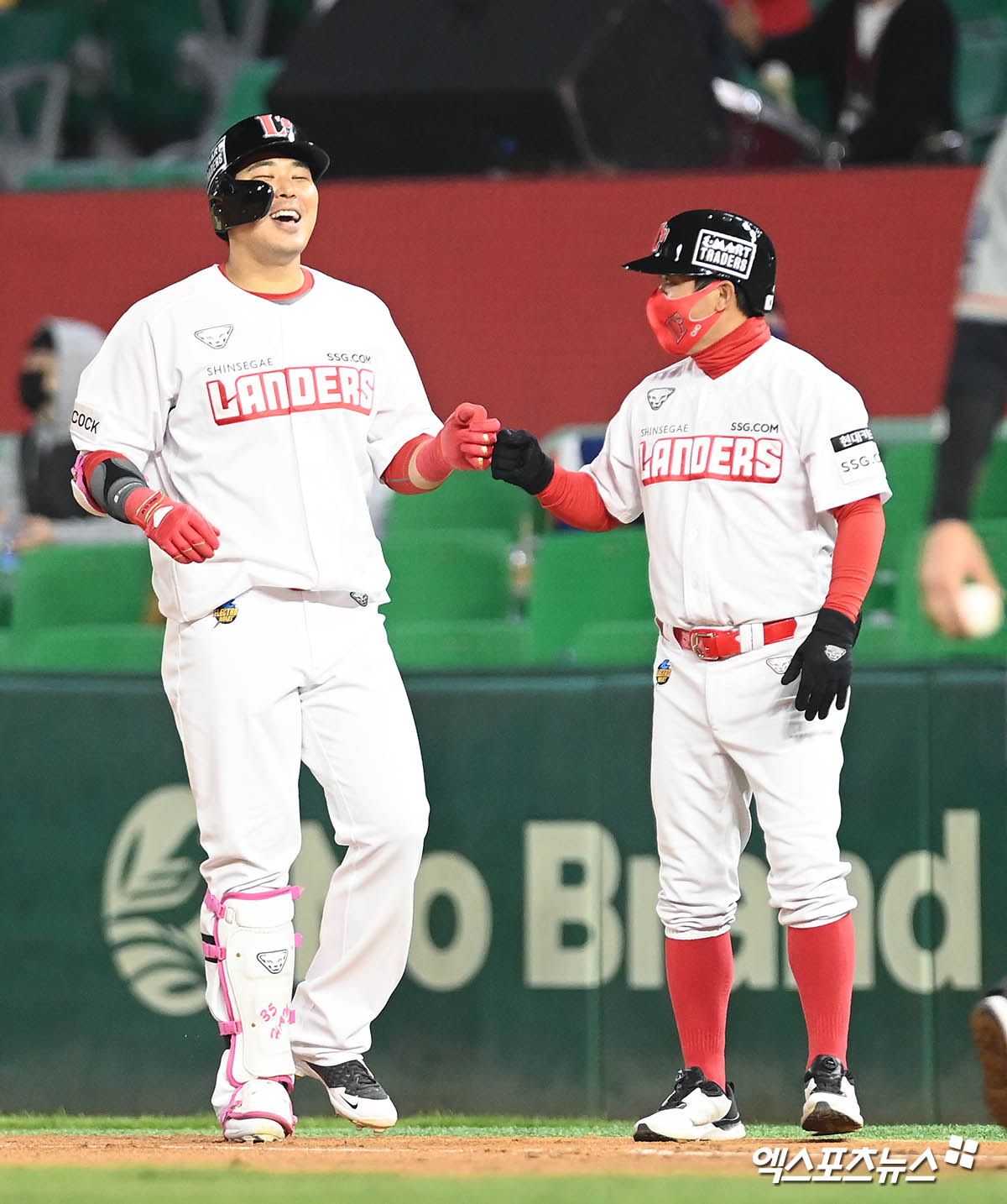 [엑스포츠뉴스 인천, 윤다희 기자] 6일 오후 인천SSG랜더스필드에서 열린 ‘2021 신한은행 SOL KBO리그’ 한화 이글스와 SSG 랜더스의 경기, 4회말 2사 SSG 한유섬이 유격수 앞 내야안타를 날리고 코칭스태프와 기쁨을 나누고 있다.