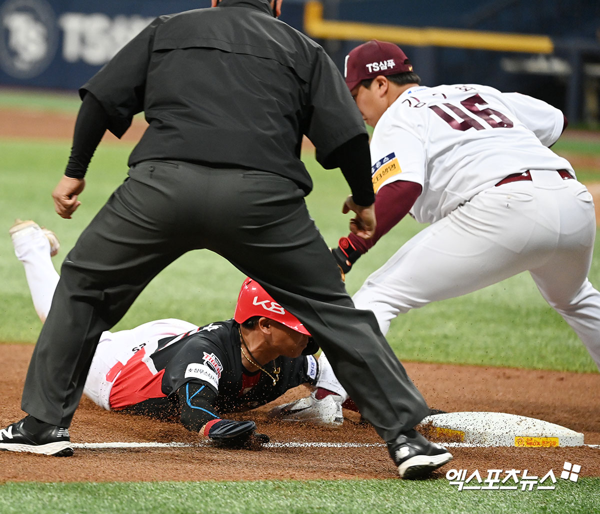 [엑스포츠뉴스 고척, 김한준 기자] 6일 오후 서울 구로구 고척스카이돔에서 열린 '2021 신한은행 SOL KBO리그' KIA 타이거즈와 키움 히어로즈의 경기, 5회초 1사 2루 KIA 박찬호가 김선빈의 중견수 플라이때 태그업을 시도했지만 키움 김수환에게 태그 아웃을 당하고 있다.