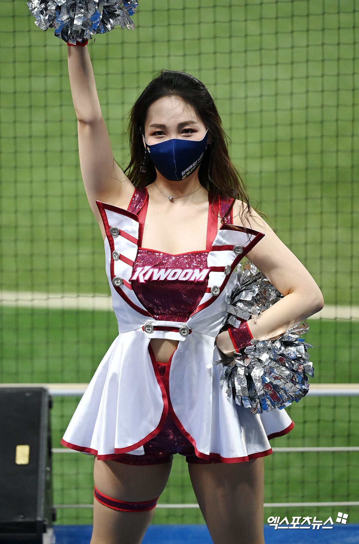 [엑스포츠뉴스 고척, 김한준 기자] 6일 오후 서울 구로구 고척스카이돔에서 열린 '2021 신한은행 SOL KBO리그' KIA 타이거즈와 키움 히어로즈의 경기, 치어리더 신수인이 멋진 공연을 선보이고 있다.