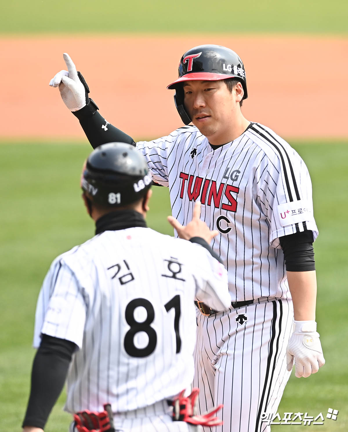 [엑스포츠뉴스 잠실, 윤다희 기자] 10일 오후 서울 송파구 잠실야구장에서 열린 ‘2021 신한은행 SOL KBO 리그’ SSG 랜더스와 LG 트윈스의 경기, 1회말 1사 LG 김현수가 좌익수 오른쪽 안타를 날린 뒤 세리머니를 하고 있다.