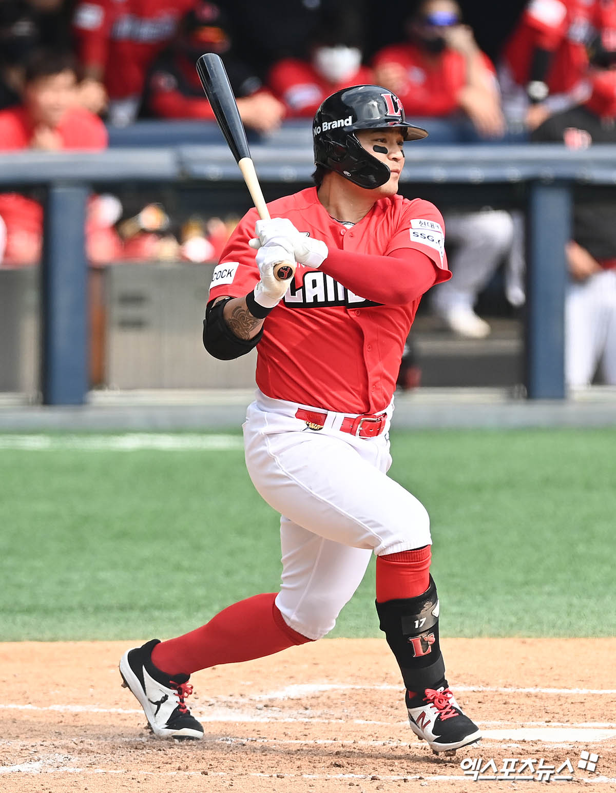 [엑스포츠뉴스 잠실, 윤다희 기자] 10일 오후 서울 송파구 잠실야구장에서 열린 ‘2021 신한은행 SOL KBO 리그’ SSG 랜더스와 LG 트윈스의 경기, 3회초 1사 1루 SSG 추신수가 우익수 오른쪽 안타를 날리고 있다.