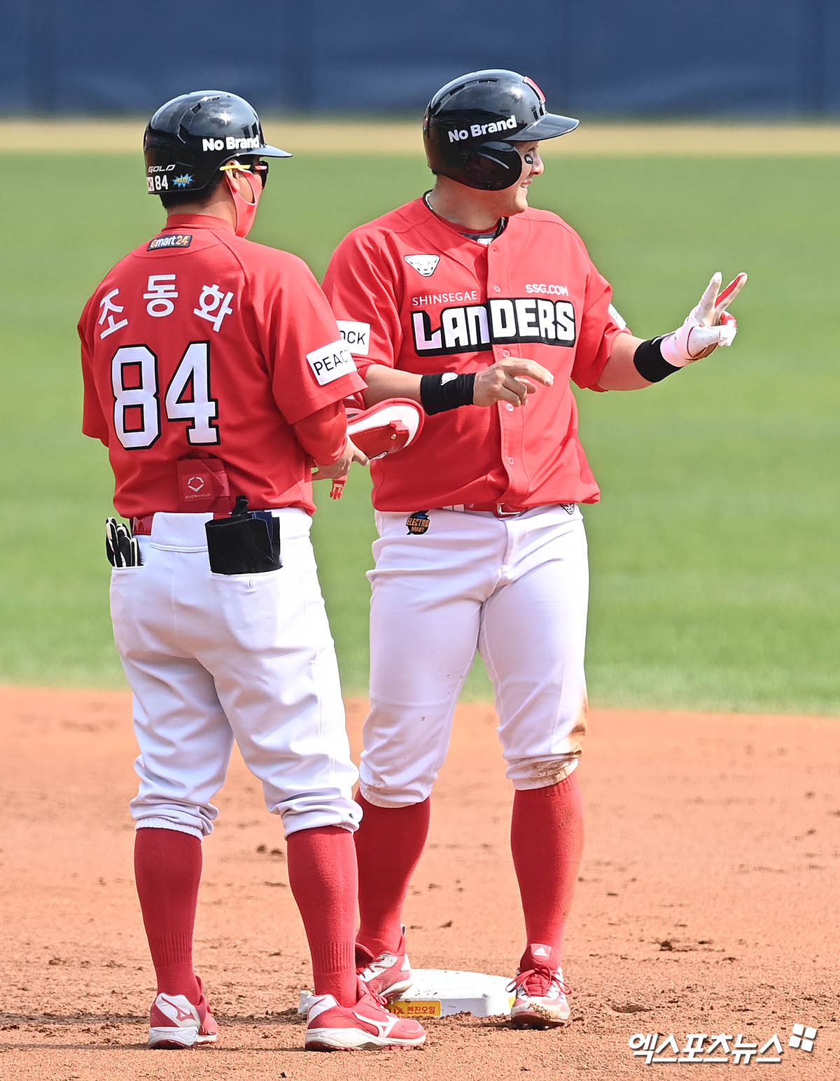 [엑스포츠뉴스 잠실, 윤다희 기자] 10일 오후 서울 송파구 잠실야구장에서 열린 ‘2021 신한은행 SOL KBO 리그’ SSG 랜더스와 LG 트윈스의 경기, 3회초 2사 2루 SSG 최주환이 1타점 적시 2루타를 날리고 기뻐하고 있다.