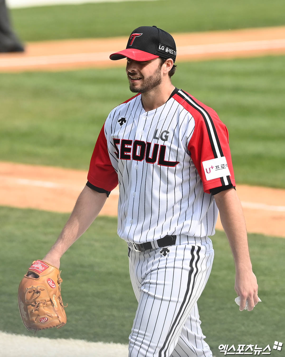 [엑스포츠뉴스 잠실, 박지영 기자] 11일 오후 서울 송파구 잠실야구장에서 열린 '2021 신한은행 SOL KBO리그' SSG 랜더스와 LG 트윈스의 경기, 4회초 종료 후 LG 선발투수 수아레즈가 더그아웃으로 향하며 미소짓고 있다.