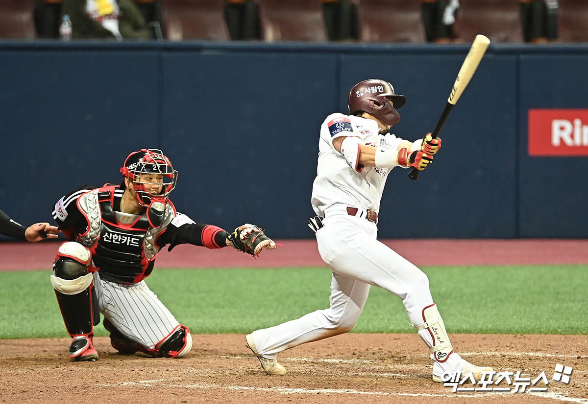 [엑스포츠뉴스 고척, 윤다희 기자] 13일 오후 서울 구로구 고척스카이돔에서 열린 ‘2021 신한은행 SOL KBO리그’ LG 트윈스와 키움 히어로즈의 경기, 8회말 무사 키움 이용규가 좌익수 왼쪽 안타를 날리고 있다.