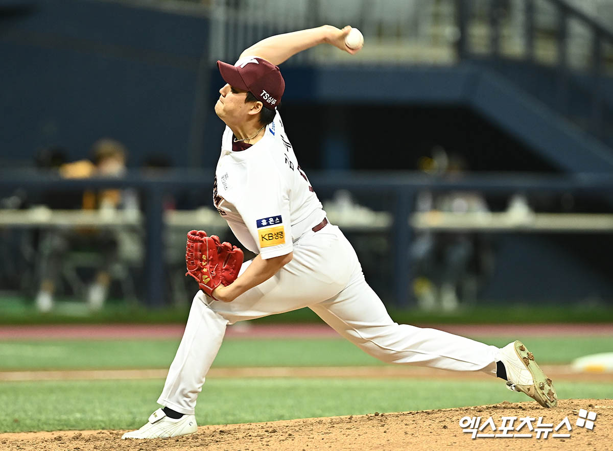 [엑스포츠뉴스 고척, 윤다희 기자] 15일 오후 서울 구로구 고척스카이돔에서 열린 ‘2021 신한은행 SOL KBO리그’ LG 트윈스와 키움 히어로즈의 경기, 7회초 키움 김태훈이 역투하고 있다.