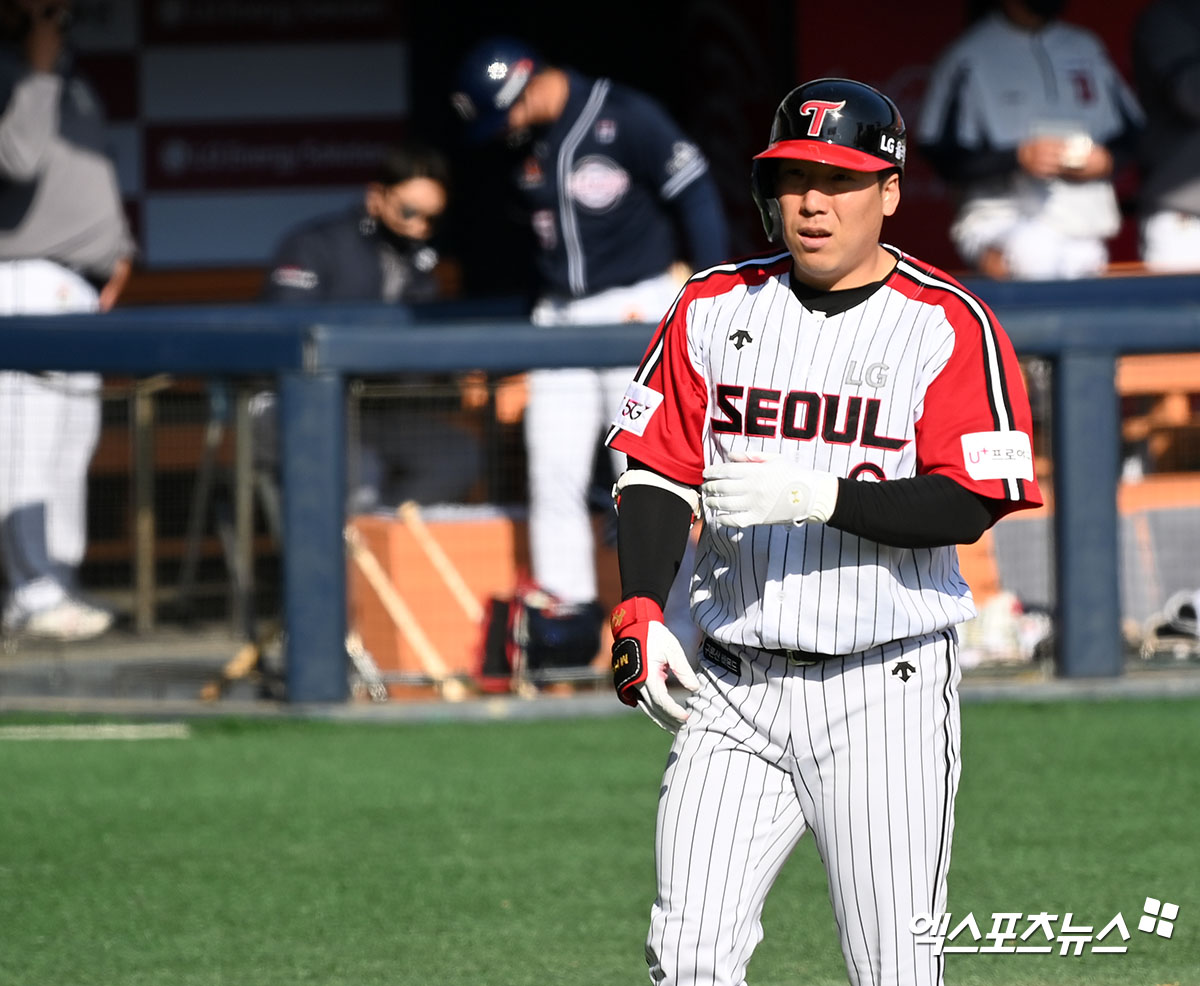 [엑스포츠뉴스 잠실, 김한준 기자] 18일 오후 서울 송파구 잠실야구장에서 열린 '2021 신한은행 SOL KBO리그' 두산 베어스와 LG 트윈스의 경기, 5회말 2사 1루 LG 김현수가 헛스윙 삼진을 당한 후 아쉬워하고 있다.