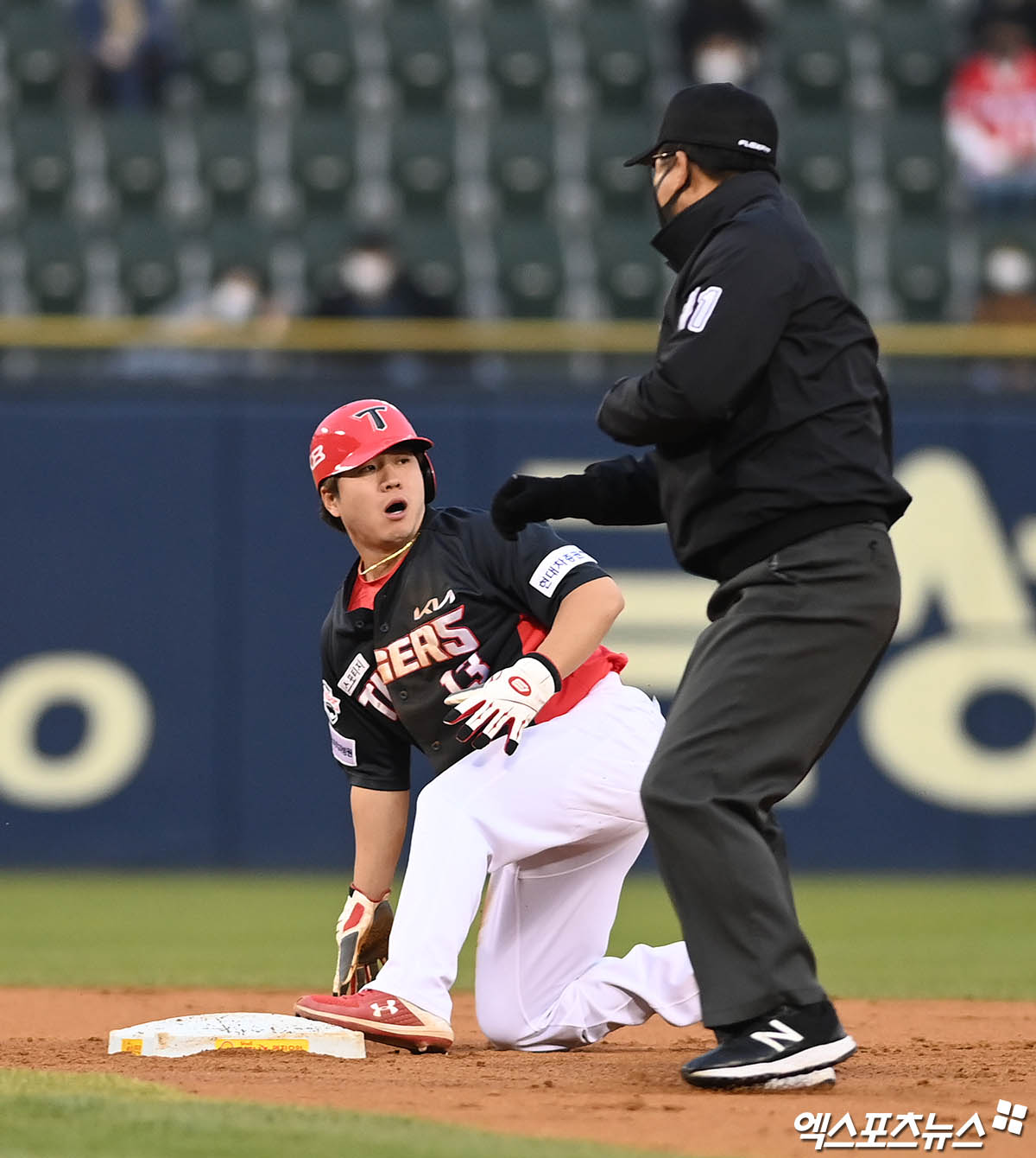 [엑스포츠뉴스 잠실, 박지영 기자] 20일 오후 서울 송파구 잠실야구장에서 열린 '2021 신한은행 SOL KBO리그' KIA 타이거즈와 LG 트윈스의 경기, 2회초 2사 1루 KIA 박찬호 타석 때 1루주자 이창진이 2루 도루 시도 후 아웃 판정을 받자 당황한 표정을 짓고 있다. 최초 판정 주자 아웃 되었으나 KIA측 요청으로 비디오 판독 실시, 원심 번복되며 세이프.