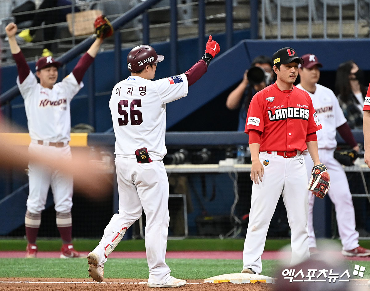 [엑스포츠뉴스 고척, 김한준 기자] 25일 오후 서울 구로구 고척스카이돔에서 열린 '2021 신한은행 SOL KBO리그' SSG 랜더스와 키움 히어로즈의 경기, 8회말 2사 1,2루 키움 이지영이 1타점 적시타를 날린 후 세리머니를 하고 있다.