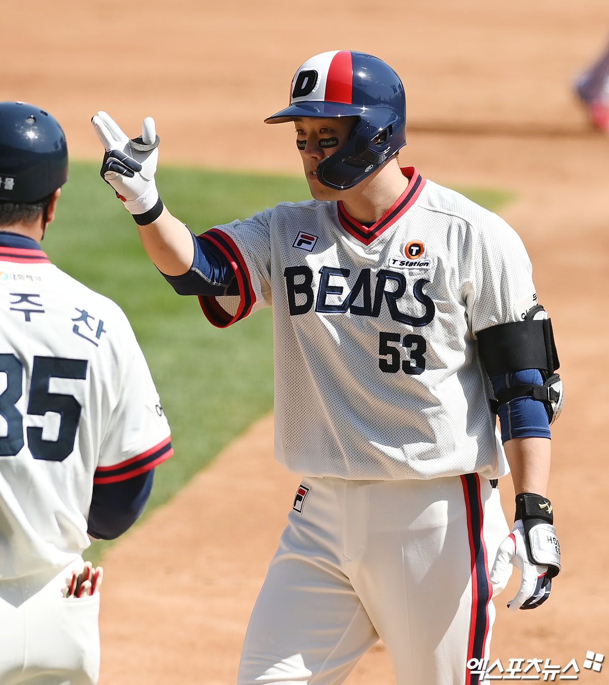 [엑스포츠뉴스 잠실, 박지영 기자] 5일 오후 서울 송파구 잠실야구장에서 열린 '2021 신한은행 SOL KBO리그' LG 트윈스와 두산 베어스의 경기, 3회말 1사 3루 두산 양석환이 1타점 적시타를 때려낸 뒤 세리머니를 하고 있다.