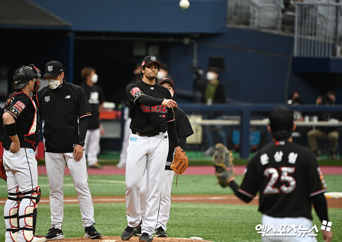 [엑스포츠뉴스 고척, 김한준 기자] 5일 오후 서울 구로구 고척스카이돔에서 열린 '2021 신한은행 SOL KBO리그' KT 위즈와 키움 히어로즈의 경기, 5회말 2사 KT 선발투수 쿠에바스가 투구수 100개를 채우고 마운드를 내려가고 있다.