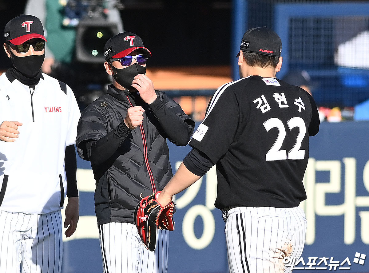 선발 투수 케이시 켈리는 6이닝(투구 수 98구) 7피안타 3탈삼진 5볼넷 4실점으로 올 시즌 들어 가장 많은 볼넷과 실점을 기록했고, 경기 초반까지 적지 않은 투구 수를 기록했는데도 6회 말까지 버티다가 타선의 지원을 받고 시즌 2승(1패)째를 거뒀다. 이어 정우영(1이닝)-김대유(⅓이닝)-송은범(⅔이닝)-고우석(1이닝)이 무실점 투구를 이어갔다.