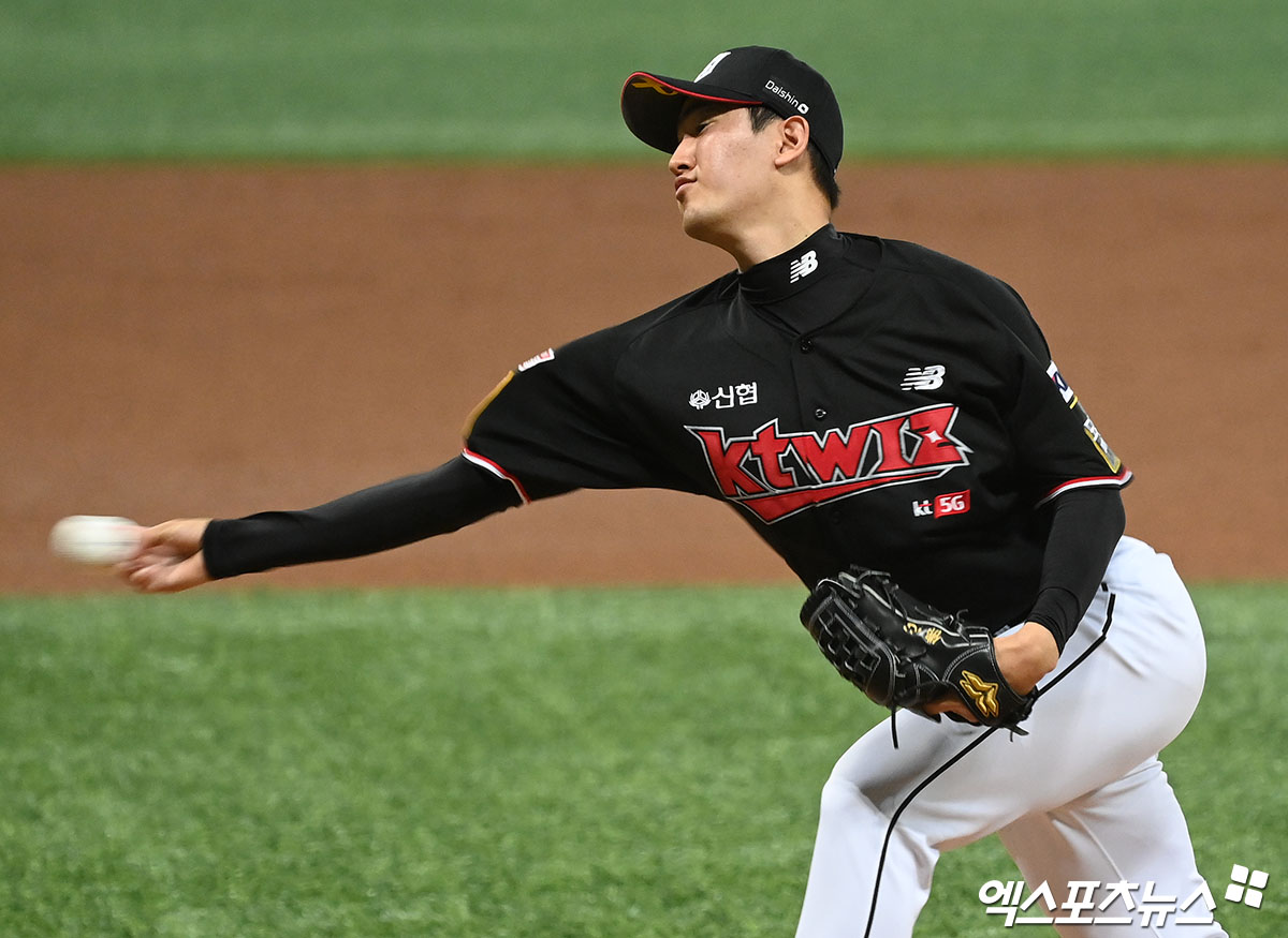 [엑스포츠뉴스 고척, 김한준 기자] 6일 오후 서울 구로구 고척스카이돔에서 열린 '2021 신한은행 SOL KBO리그' KT 위즈와 키움 히어로즈의 경기, 1회말 KT 선발투수 고영표가 공을 힘차게 던지고 있다.