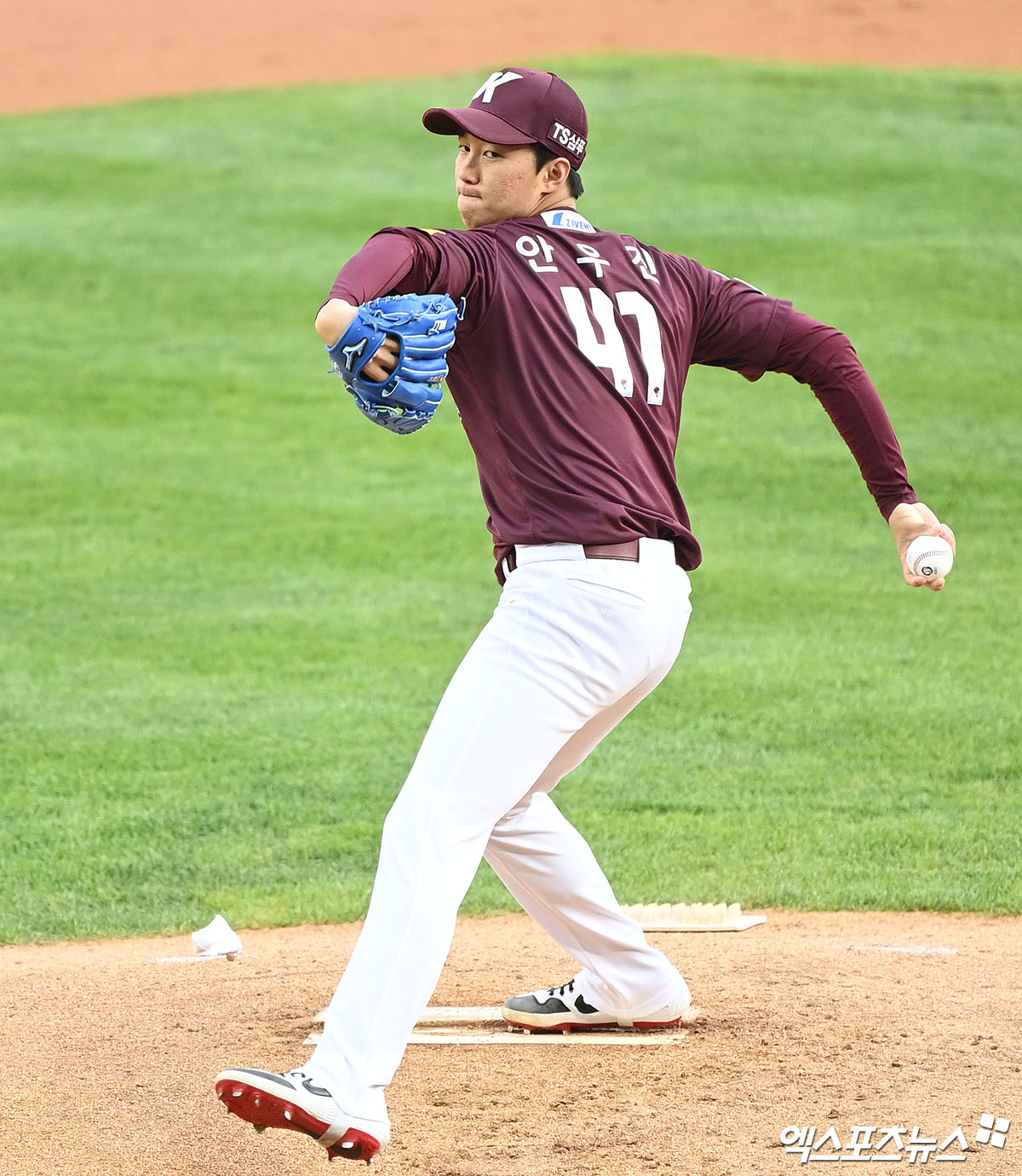 [엑스포츠뉴스 잠실, 김한준 기자] 11일 오후 서울 송파구 잠실야구장에서 열린 '2021 신한은행 SOL KBO리그' 키움 히어로즈와 두산 베어스의 경기, 1회말 키움 선발투수 안우진이 공을 힘차게 던지고 있다.
