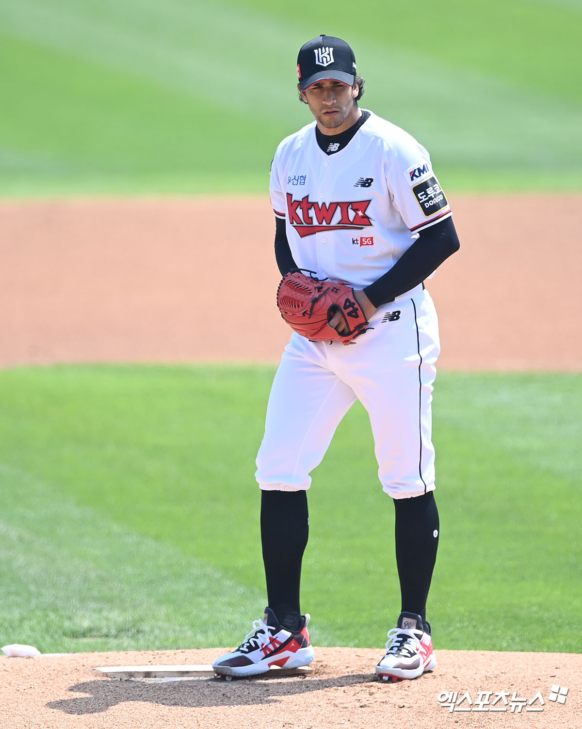 [엑스포츠뉴스 수원, 김한준 기자] 19일 오후 수원 kt위즈파크에서 열린 '2021 신한은행 SOL KBO리그' 두산 베어스와 KT 위즈의 경기, 1회초 KT 선발투수 쿠에바스가 공을 힘차게 던지고 있다.