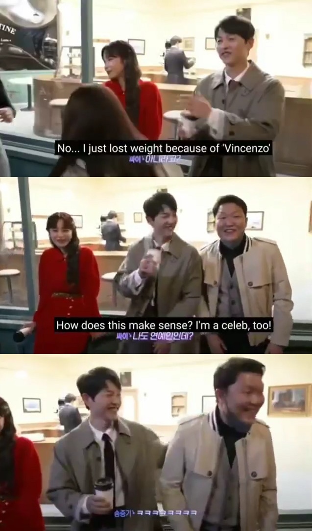 영상 속 싸이는 송중기를 향해 "얼굴이 왜 이렇게 작냐"라고 물었고 송중기는 "아니다. 드라마 때문에 살 빠져서 그렇다"라고 답했다.