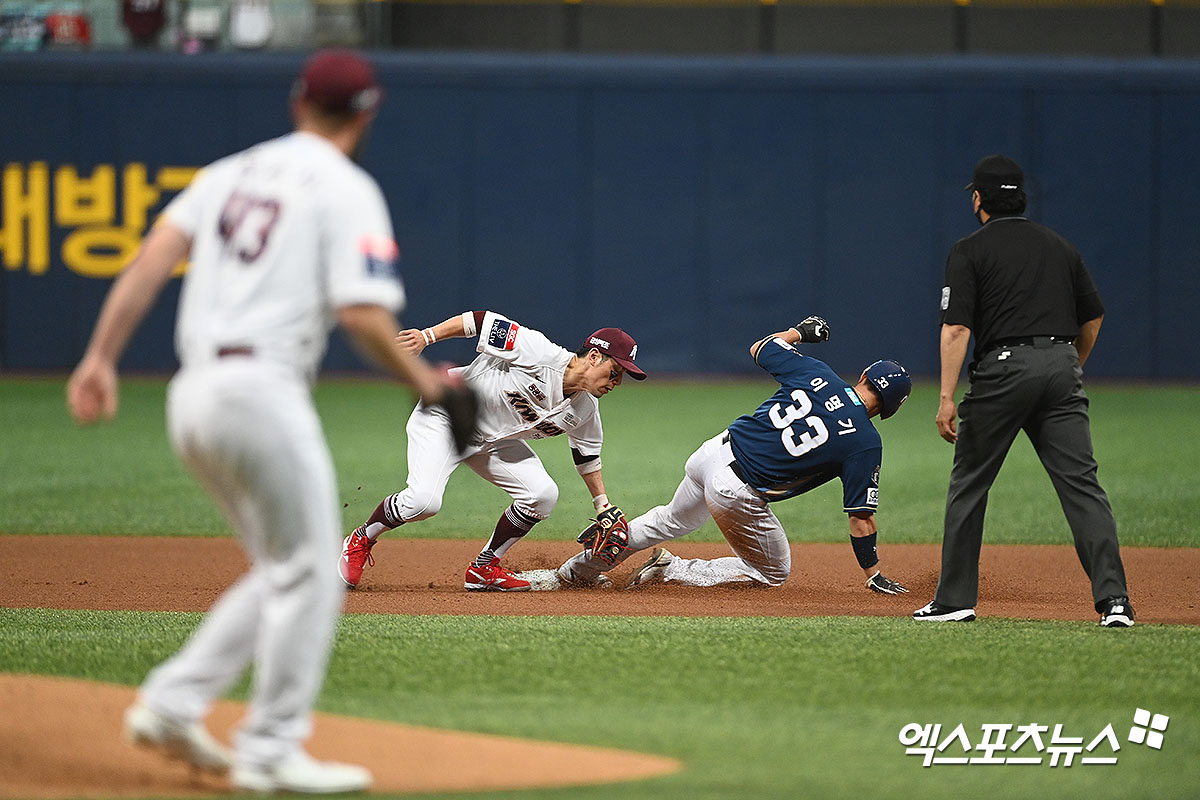 [엑스포츠뉴스 고척, 김한준 기자] 22일 오후 서울 구로구 고척스카이돔에서 열린 '2021 신한은행 SOL KBO리그' NC 다이노스와 키움 히어로즈의 경기, 1회초 2사 1루 키움 서건창이 2루 도루를 시도한 NC 이명기를 태그아웃 시키고 있다.