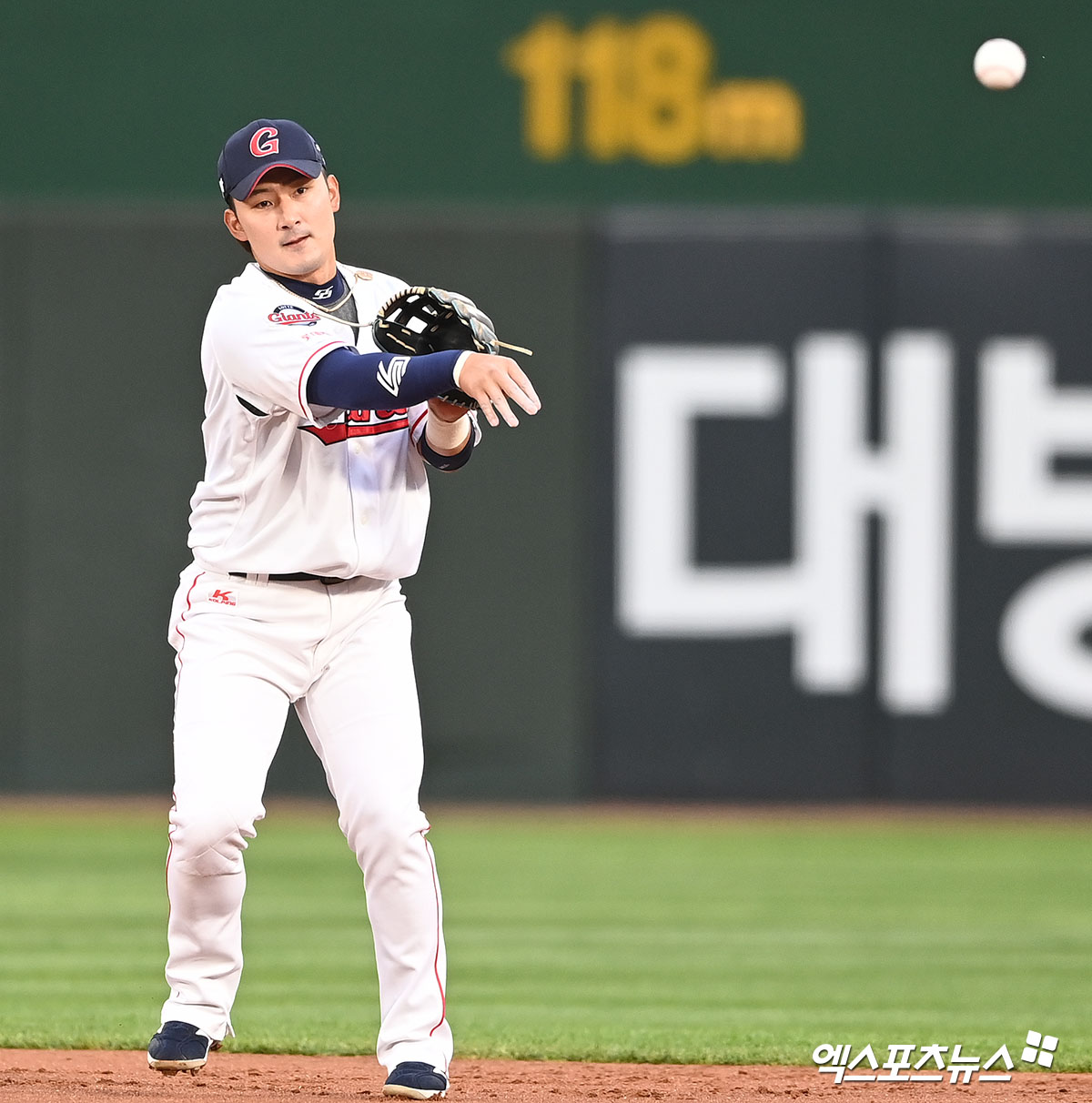 [엑스포츠뉴스 부산, 김한준 기자] 26일 오후 부산 사직야구장에서 열린 '2021 신한은행 SOL KBO리그' LG 트윈스와 롯데 자이언츠의 경기, 1회초 롯데 김민수가 LG 홍창기의 타구를 잡아 1루로 송구하고 있다.