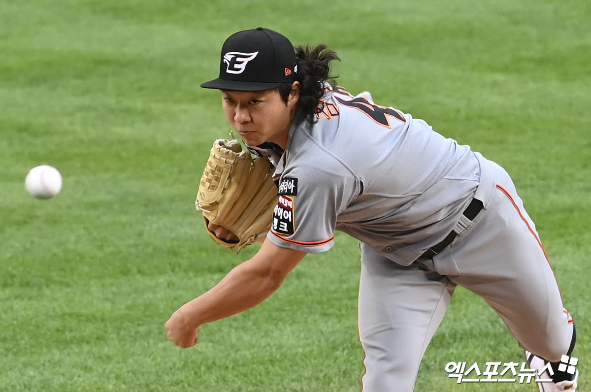 [엑스포츠뉴스 잠실, 고아라 기자] 26일 오후 서울 송파구 잠실야구장에서 열린 '2021 신한은행 SOL KBO리그' 한화 이글스와 두산 베어스의 경기, 1회말 한화 선발투수 김범수가 공을 힘차게 던지고 있다.