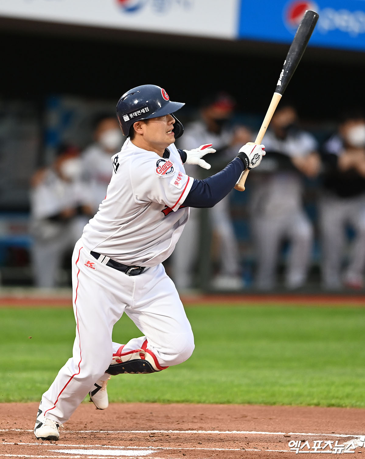 [엑스포츠뉴스 부산, 김한준 기자] 26일 오후 부산 사직야구장에서 열린 '2021 신한은행 SOL KBO리그' LG 트윈스와 롯데 자이언츠의 경기, 1회말 2사 3루 롯데 민병헌이 타격을 하고 있다.