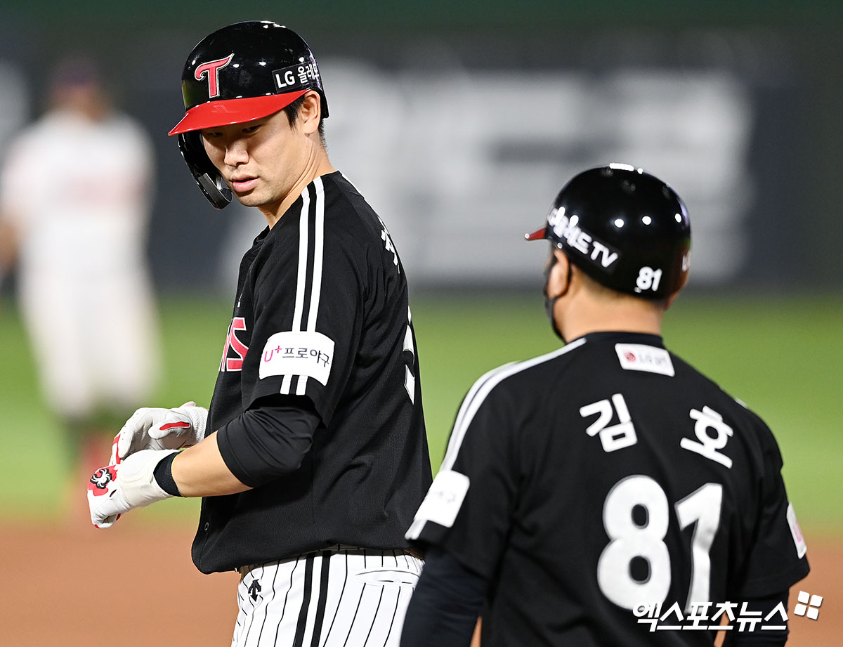 [엑스포츠뉴스 부산, 김한준 기자] 27일 오후 부산 사직야구장에서 열린 '2021 신한은행 SOL KBO리그' LG 트윈스와 롯데 자이언츠의 경기, 6회초 2사 LG 홍창기가 좌전안타를 날린 후 귀루하고 있다.