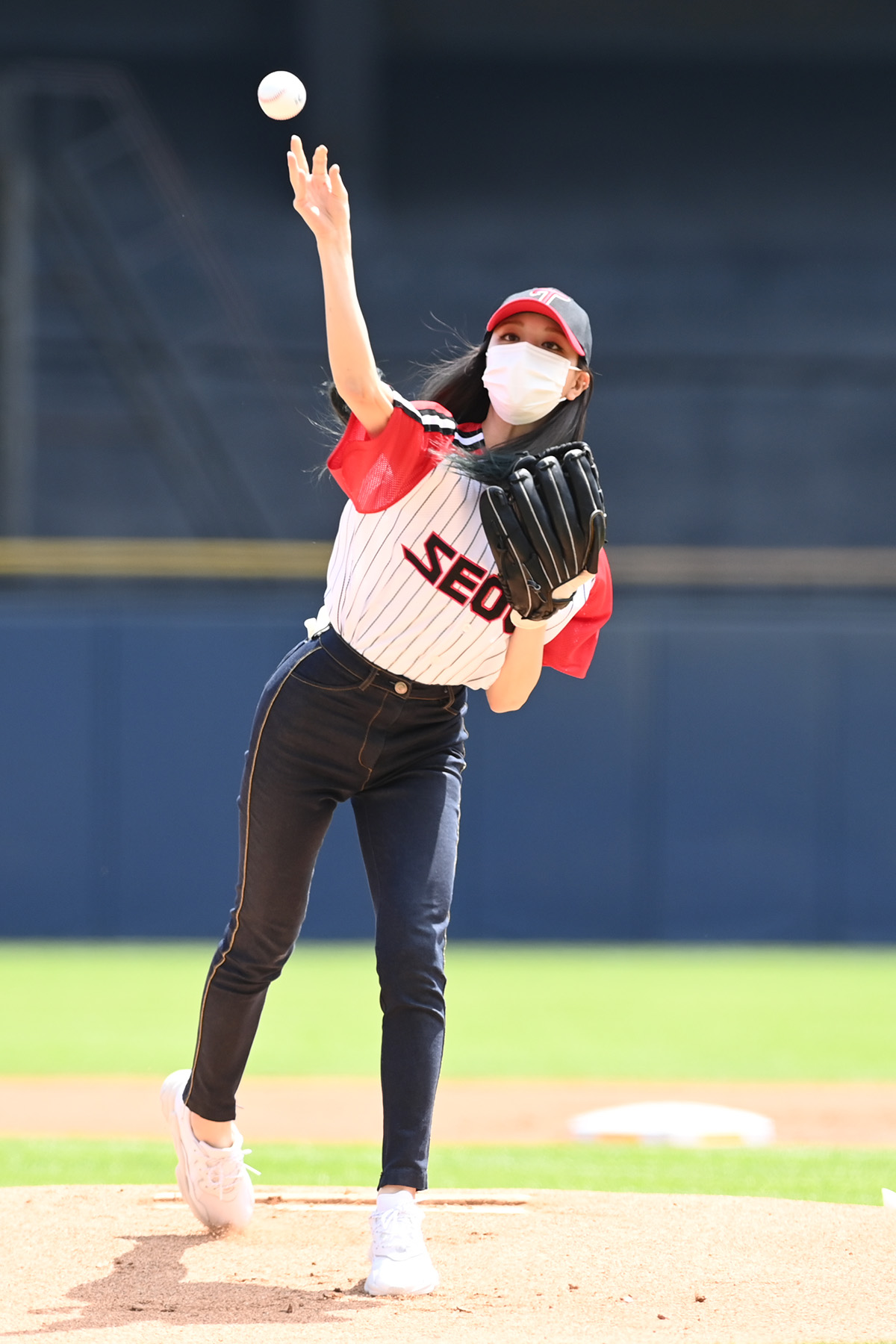 [엑스포츠뉴스 잠실, 고아라 기자] 30일 오후 서울 송파구 잠실야구장에서 열리는 '2021 신한은행 SOL KBO리그' 키움 히어로즈와 LG 트윈스의 경기에 앞서 있지 유나가 시구를 하고 있다.