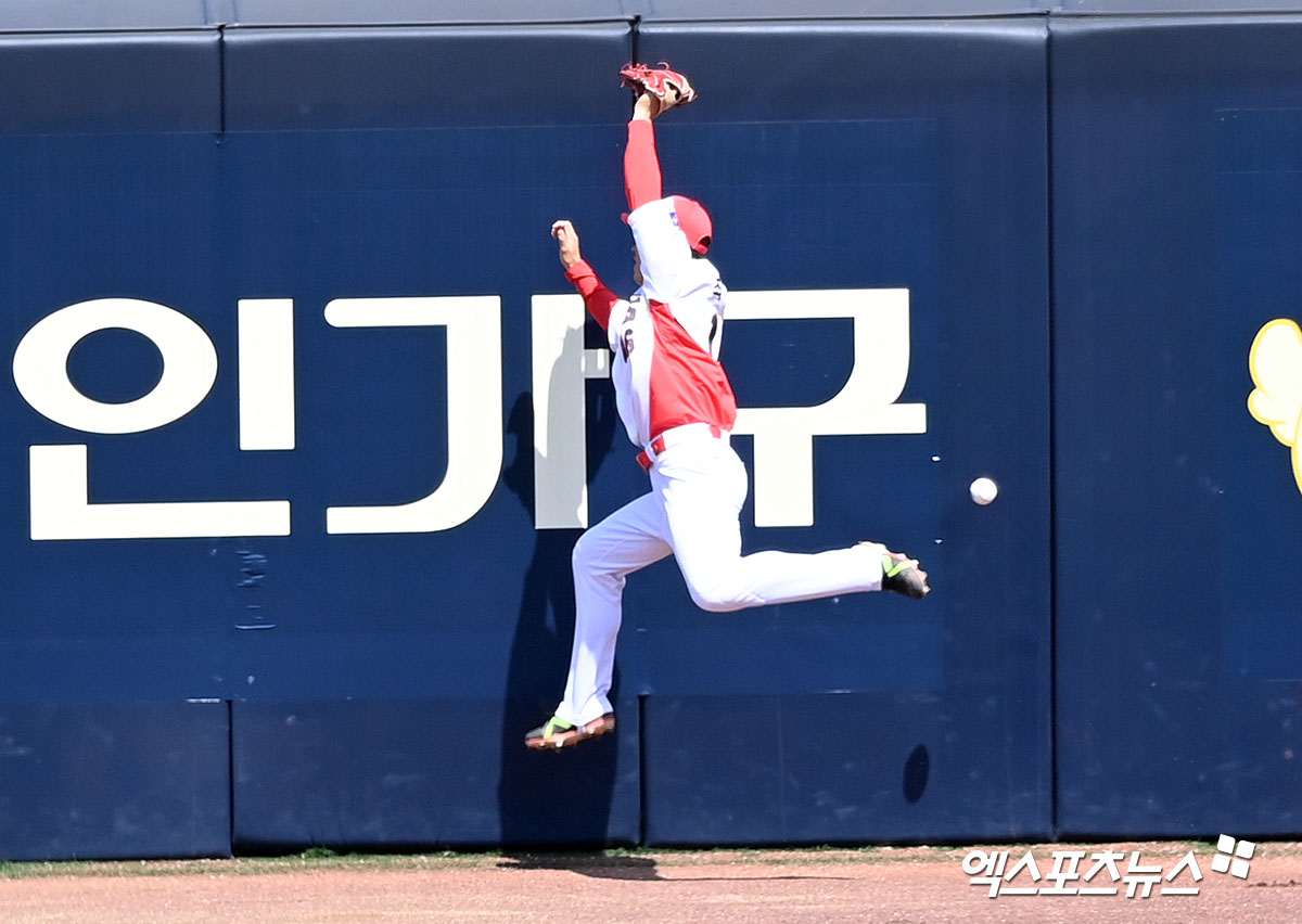 [엑스포츠뉴스 광주, 김한준 기자] 30일 오후 광주-기아 챔피언스필드에서 열린 '2021 신한은행 SOL KBO리그' KT 위즈와 KIA 타이거즈의 경기, 2회초 KIA 최원준이 알먼테의 타구를 잡기 위해 점프를 시도하고 있다.
