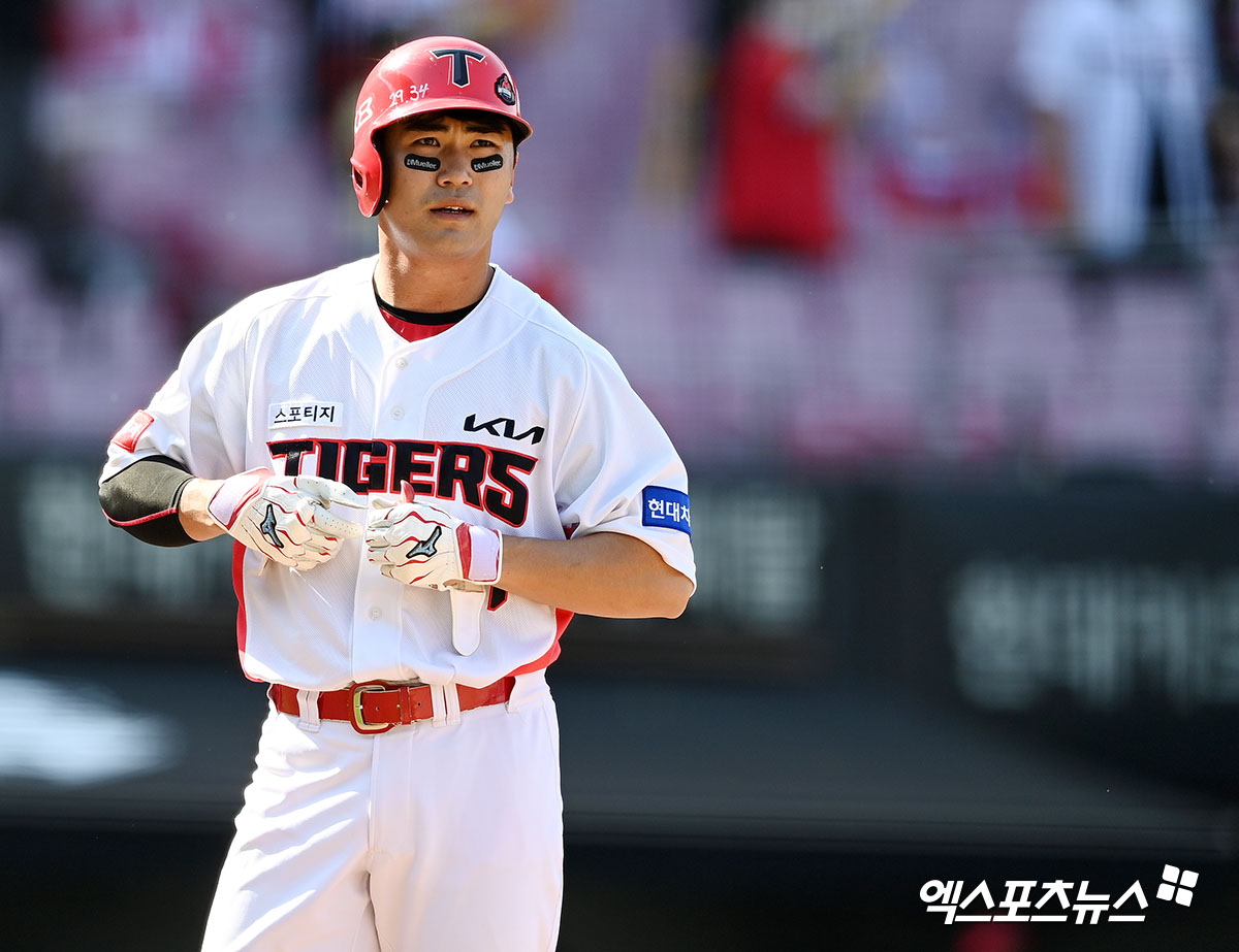 [엑스포츠뉴스 광주, 김한준 기자] 30일 오후 광주-기아 챔피언스필드에서 열린 '2021 신한은행 SOL KBO리그' KT 위즈와 KIA 타이거즈의 경기, 7회말 2사 KIA 최정용이 볼넷으로 출루하고 있다.